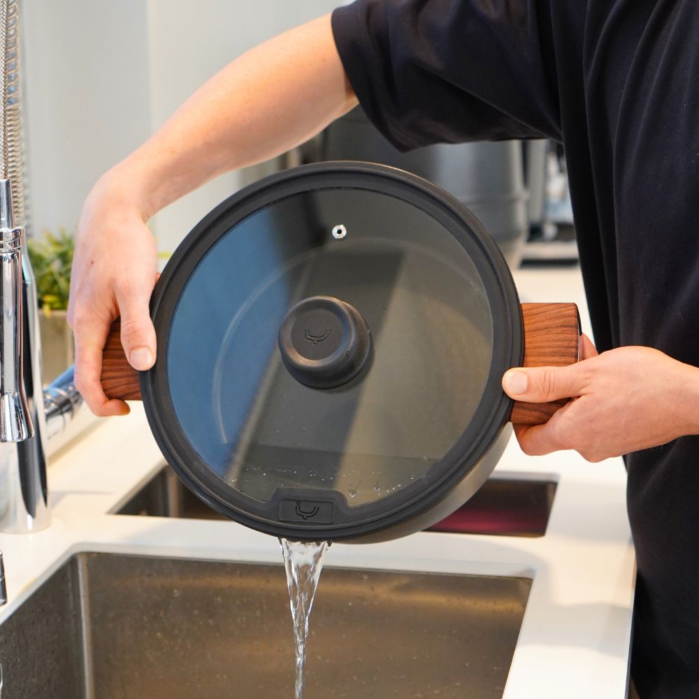 Avec un diamètre généreux de 29 cm et une capacité de 6,1 litres, cette casserole est indispensable pour les grands plats. Les poignées de la casserole ne sont pas résistantes au four.
