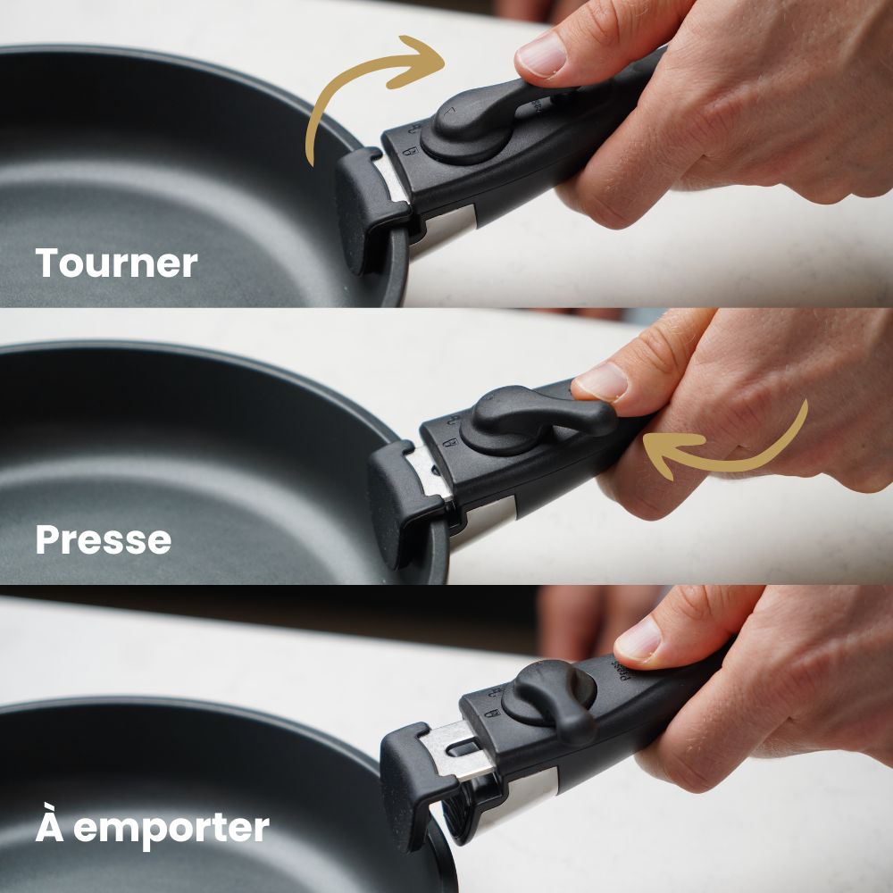 En retirant la poignée, vous pouvez utiliser les poêles sans effort dans le four, sur la table à manger ou dans le réfrigérateur.